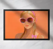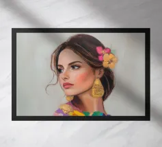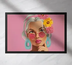 Questa elegante illustrazione di ritratto di una giovane donna incarna il look estivo con il suo top con le spalline e i fiori colorati in morbide tonalità pastello. Con occhiali da sole, orecchini e collana, la giovane irradia freschezza, mentre l'acconciatura bionda e il cerchietto completano il suo look. Circondata da un gioco di colori arancioni, rosa e beige, porta alla ribalta il sole, la spiaggia e il mare.