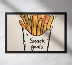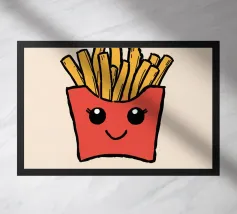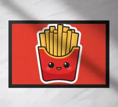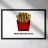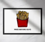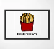 Una grafica audace presenta un contenitore rosso pieno di patatine fritte giallo oro sopra il testo umoristico "FRIES BEFORE GUYS".