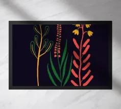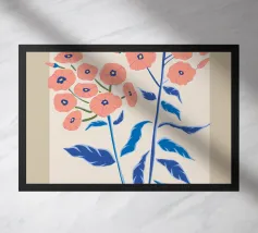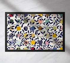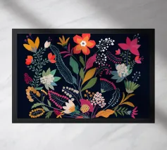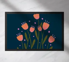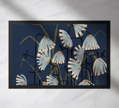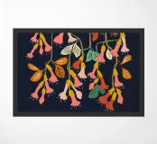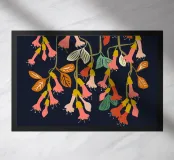 Ein verspieltes, botanisches Muster mit hängenden glockenförmigen Blüten in Rosé-, Korallen- und Rottönen. Die geschwungenen Ranken wirken wie ein natürlicher Vorhang, durchsetzt von stilisierten Blättern in warmem Orange und kühlem Grün. Auf dunkelblauem Hintergrund entsteht ein moderner, leicht folkloristischer Look.
