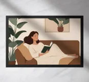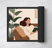 Un dipinto digitale minimalista di una donna sdraiata su un divano con un libro in mano. Circondata da rigogliose piante da interno e da una tazza di caffè fumante, la scena cattura l'essenza della cura di sé e delle serate lente a casa. Perfetto per interni moderni e accoglienti.
