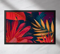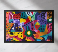 Una composizione astratta che fonde elementi floreali stilizzati con audaci forme geometriche in una vibrante tavolozza di blu, gialli, arancioni e verdi, creando una dichiarazione artistica dinamica e moderna.
