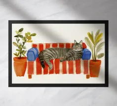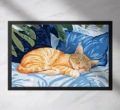 gatto gatto arancione gatto che dorme letto cuscini piante fogliame pianta da interno foglie tropicali foglie di monstera cuscini relax arredamento per la casa animale domestico riposo consistenza morbida animale domestico calma tempo libero foglie verdi