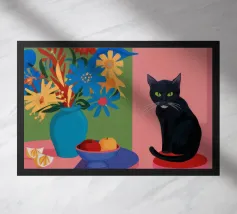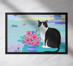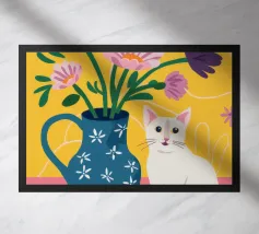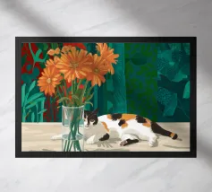 Un gatto bianco e nero siede regalmente dietro un grande vaso di fiori con motivi a strisce vivaci, sullo sfondo di una tenda rosa, creando una natura morta suggestiva e affascinante.