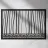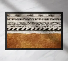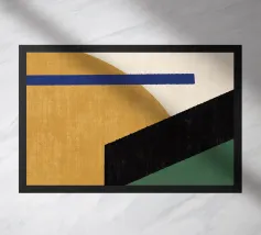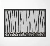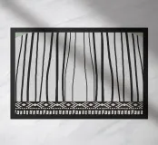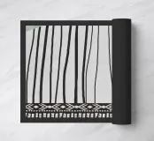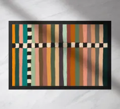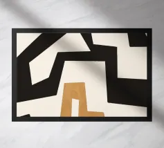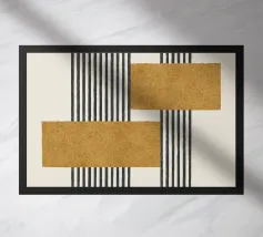 I motivi geometrici dominano l'immagine, con linee nere verticali su sfondo bianco. Varie forme, tra cui triangoli e rettangoli, si alternano per creare un senso di equilibrio e simmetria.