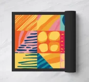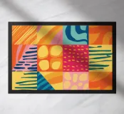 Un'opera astratta vibrante e allegra che assomiglia a una trapunta patchwork, con vari motivi e trame dai colori vivaci e solari. L'opera è una gioiosa celebrazione del colore e della forma.
