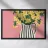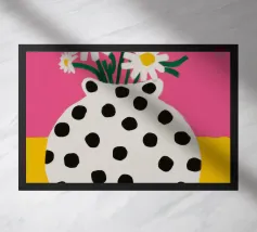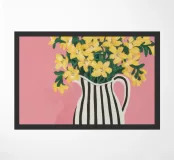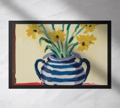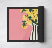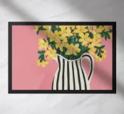 Una natura morta moderna e grafica di un bouquet di fiori gialli brillanti in un vaso a righe bianche e nere di grande effetto. Lo sfondo rosa tenue crea un delicato contrasto con i motivi e i colori audaci.