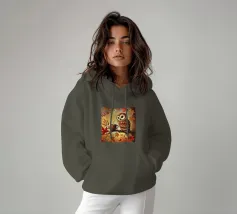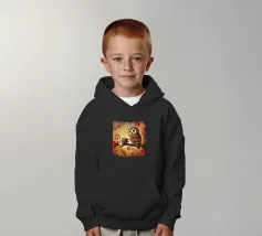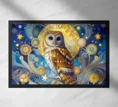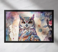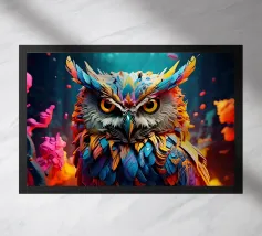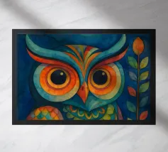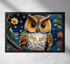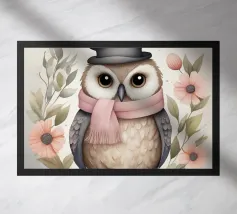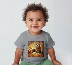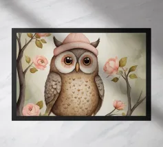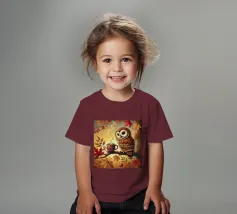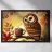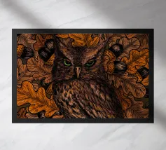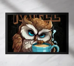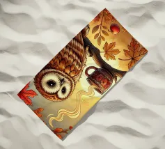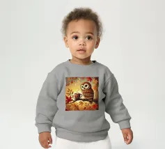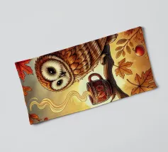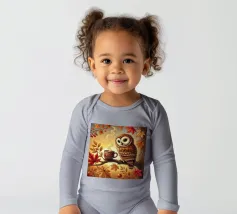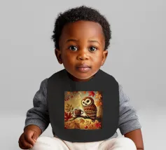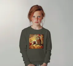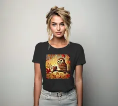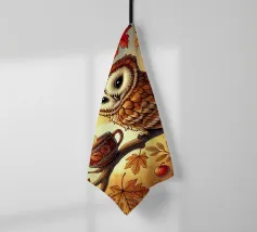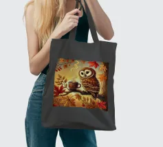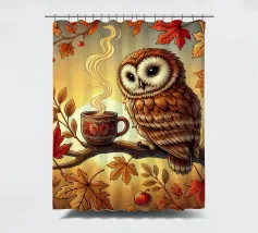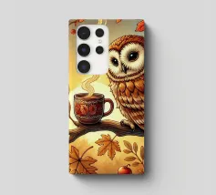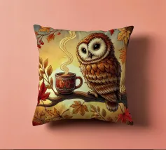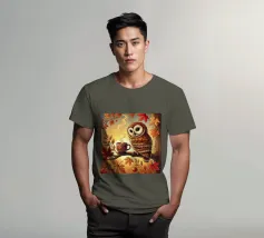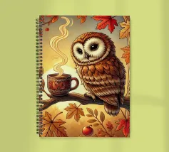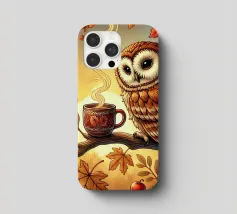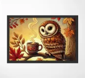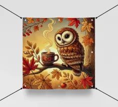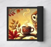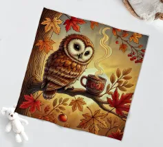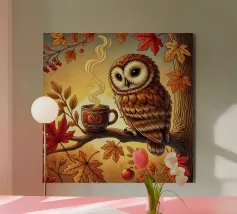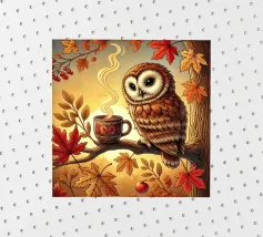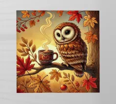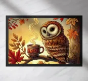 Un'affascinante illustrazione in stile cartoon di un gufo appollaiato con grazia su un ramo d'albero, circondato da vivaci foglie autunnali nelle calde tonalità del rosso, dell'arancio e dell'oro. Il gufo tiene in mano una tazza di sidro fumante, mentre la morbida luce dorata di un tranquillo tramonto illumina la scena. L'ambiente tranquillo e i dettagli stravaganti evocano l'accogliente bellezza dell'autunno.