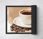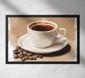 Una tazza di caffè nero su un piattino, circondata da chicchi di caffè sparsi - raffigurata in toni beige morbidi e caldi dal carattere pittoresco. L'immagine emana calma, concentrazione e piacere aromatico. Perfetto per gli amanti del caffè, per l'arredamento dei bar o per gli spazi di lavoro che hanno bisogno di promuovere un ambiente calmo ma elegante.