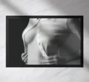 Uno scatto glamour di una Hannah in lingerie bianca e cardigan.