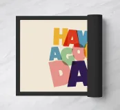 Un design tipografico audace e allegro con la frase edificante "Have a Good Day" in lettere grandi, grosse e colorate con un effetto semi-opaco su uno sfondo color crema. Questa opera d'arte divertente e positiva è pensata per diffondere gioia e rallegrare qualsiasi spazio. Perfetta per pareti colorate, interni allegri e capi d'abbigliamento che regalano sorrisi a tutti. Ideale per chi ama i disegni vivaci e di grande impatto con un tocco giocoso. Progettato da showmemars