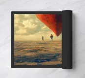 Un cuore colossale e consumato dalle intemperie fluttua serenamente sopra un vasto paesaggio incrinato, simbolo potente di un amore duraturo in un mondo desolato. Due piccole figure si ergono al suo cospetto, aggiungendo la scala epica e l'atmosfera cinematografica di questa opera d'arte surreale. Con i suoi toni vintage e le sue immagini che fanno riflettere, quest'opera è un invito alla conversazione e un tributo al grande viaggio dell'amore.