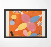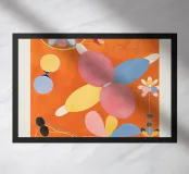 Questa vivace stampa d'arte presenta "The Ten Largest (No.4)" di Hilma af Klint, un'accattivante opera astratta del 1907. Su un caldo sfondo arancione, la composizione è piena di grandi forme organiche e geometriche sovrapposte in una tavolozza di rosa, gialli, blu e bianchi, che creano un senso di energia giocosa e di vita nascente. Intricati motivi floreali e linee vorticose aggiungono un'estetica dinamica e simbolica. Firmata "H. af Klint", quest'opera mostra la visione spirituale e astratta pionieristica di Klint, che esplora i temi della crescita e dello sviluppo. Questo poster digitale di alta qualità (7000x500