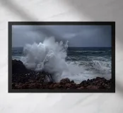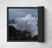 Fotografia di un'onda enorme che si abbatte sulla costa atlantica rocciosa del Portogallo.