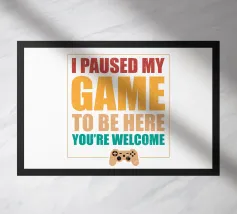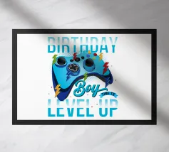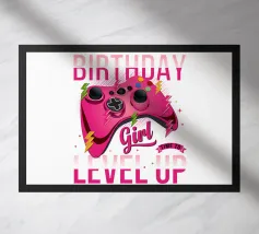 Un controller di gioco retrò è accompagnato dalla frase "Non invecchio, salgo di livello", utilizzando uno stile di carattere nostalgico. Questo design combina la cultura del gioco vintage con una visione umoristica dell'invecchiamento.