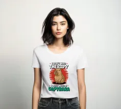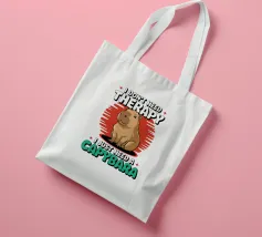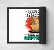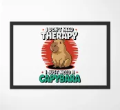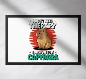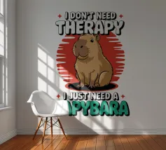 Un simpatico capibara si trova al centro di un disegno con il testo umoristico: "Non ho bisogno di terapia, ho solo bisogno di un capibara".