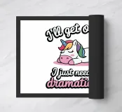 Un simpatico unicorno è sdraiato con una criniera colorata e appare rilassato e soddisfatto. Sopra e sotto l'unicorno, il testo recita umoristicamente: "Mi passerà, devo solo essere drammatico prima".