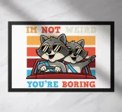 Due procioni con occhiali da sole viaggiano allegramente su un'auto rossa, con uno sfondo giocoso e colorato. La didascalia recita: "Io non sono strano, tu sei noioso".