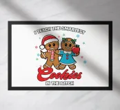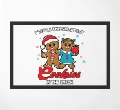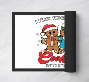Due sorridenti biscotti di pan di zenzero sono vestiti a festa, uno con un cappello da Babbo Natale e l'altro con una mela in mano. La frase "Insegno ai biscotti più intelligenti del lotto" è stampata intorno a loro, aggiungendo un tema giocoso ed educativo.