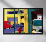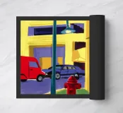 A bright red fire hydrant and a postbox stand on a city corner, their brilliant colors popping against the stylized buildings and street, a celebration of urban details.