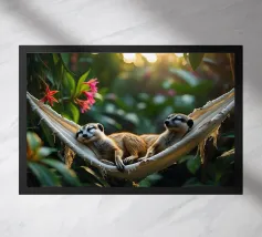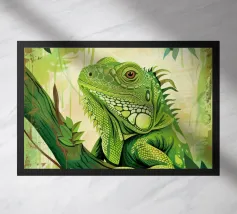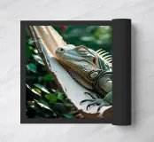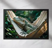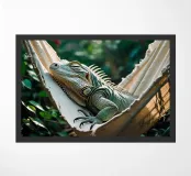 Questa iguana giace immobile sulla sua amaca, come se avesse deciso di non fare nulla oggi. Il sole filtra attraverso il verde, il tempo sembra essersi fermato. Un poster perfetto per ricordarvi che è giusto non fare nulla per un po', e che è bene tenersi l'estate ancora per un po'. Questa stampa fa parte della serie "Jungle Hammock Tales" - il relax estivo con una strizzatina d'occhio. Questa illustrazione digitale è stata creata in stile fotorealistico, con un occhio di riguardo per la luce, i dettagli e l'atmosfera. Visualizzata da Trinkets NL Design Studio utilizzando l'AI.