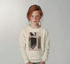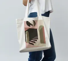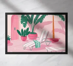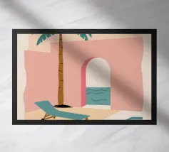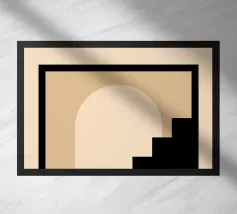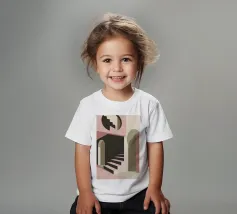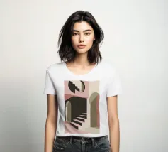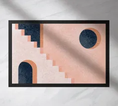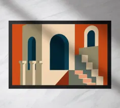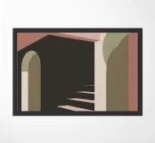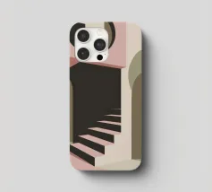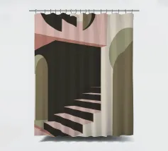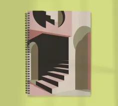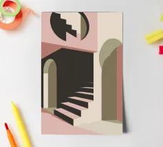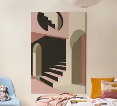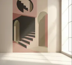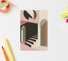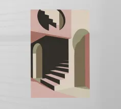 Illustrazione architettonica di una scala a chiocciola all'interno di un edificio con archi e pareti dai colori tenui. La tavolozza pastello di rosa, beige e verde crea un'atmosfera sognante, serena e leggermente surreale.