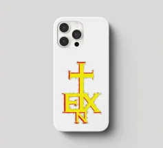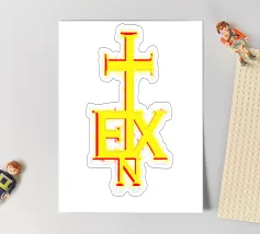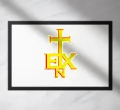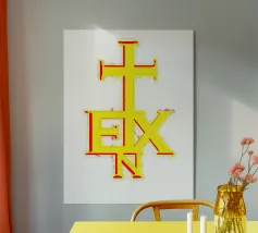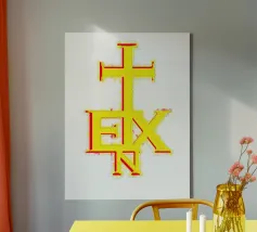 Questa sorprendente opera d'arte da parete presenta un'audace composizione a forma di croce intrecciata con intricate scritte in stile gotico, illuminate in un vibrante giallo e rosso neon.