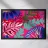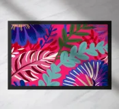 Un suggestivo disegno di foglie tropicali stilizzate in varie tonalità di indaco profondo, blu e viola, con accenni di rosa, che creano una cascata botanica ricca, dinamica ed elegante.