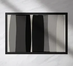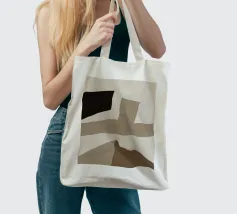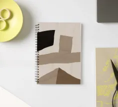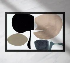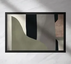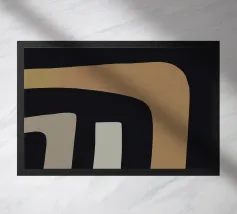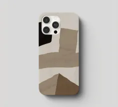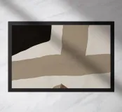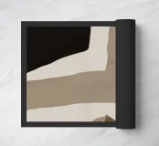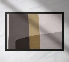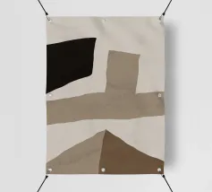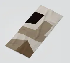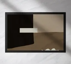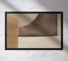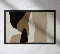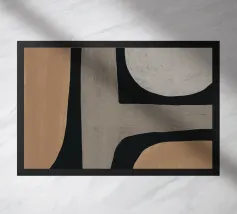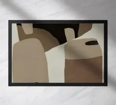 Forme astratte in varie tonalità di marrone e nero si sovrappongono su uno sfondo beige, formando una composizione che può evocare un senso di paesaggio o di architettura. La semplicità delle forme e la palette di colori della terra conferiscono al pezzo un'atmosfera minimalista e moderna.