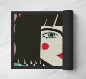 Un ritratto grafico di grande impatto di una donna con un'acconciatura nera e labbra rosse, con lo sguardo intenso rivolto all'osservatore, su uno sfondo colorato e astratto.
