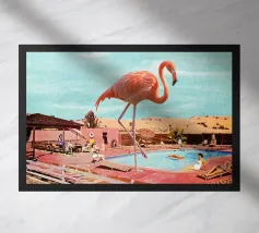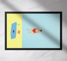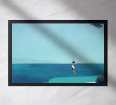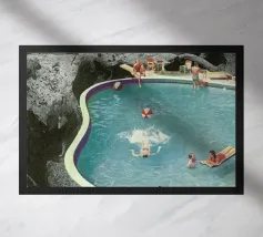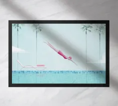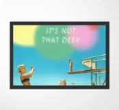 Donna che fotografa un uomo in procinto di saltare in piscina. Cielo aura sfumato e citazione 'Non è così profondo'. Surreale design retrò con piscina di motel vintage di MsGonzalez
