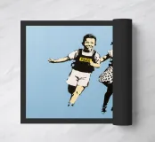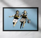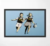Questo spiritoso e inquietante stencil di Banksy ritrae due bambini che corrono allegramente vestiti con giubbotti antiproiettile della polizia. L'immagine satireggia la militarizzazione forzata e la perdita dell'innocenza nella società moderna. Mescolando i simboli dell'infanzia con l'equipaggiamento delle forze dell'ordine, Banksy critica la presenza pervasiva della violenza e dell'autorità.