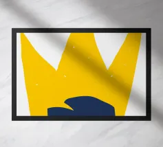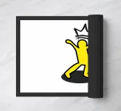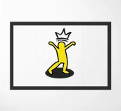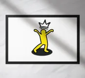 Una figura umana gialla, delineata in nero, lancia gioiosamente le braccia in aria mentre una corona si libra sopra la sua testa. Il design giocoso è caratterizzato da uno stile semplice e audace con un'ombra proiettata al di sotto.