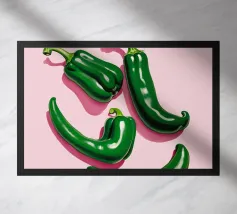 Sfondo rosa con peperoncini rossi e testo: Just chillin' Generato con l'AI (Canva), tra le altre cose.