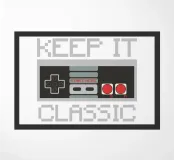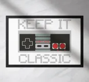 Un controller di gioco retrò è raffigurato con la frase "KEEP IT CLASSIC" in testo pixelato. Il design evoca la nostalgia grazie all'estetica vintage e alla semplice palette di colori.