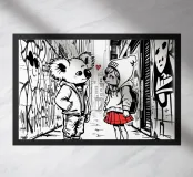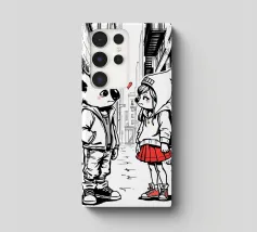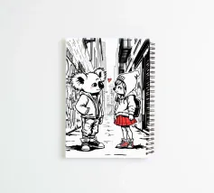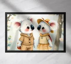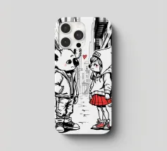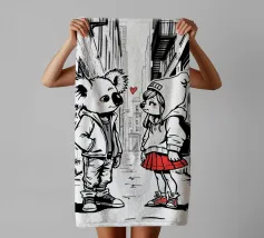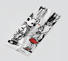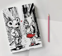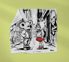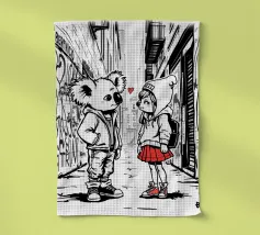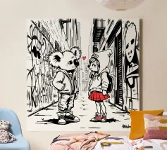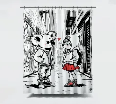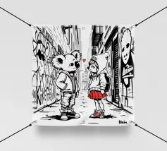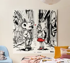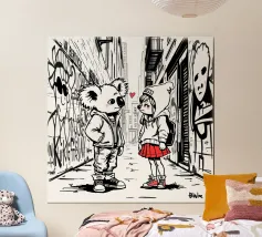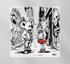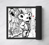 Amanti di koala urbani in stile graffiti monocromatici Questa immagine mostra un ragazzo e una ragazza koala che si scambiano sguardi civettuoli in un vicolo della città, circondati da graffiti stencil e murales di commento sociale in uno stile di schizzo audace e monocromatico.