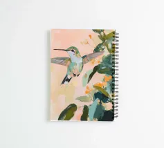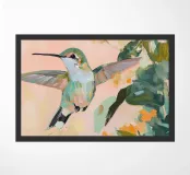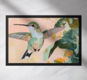 Un dipinto a olio di un colibrì, minimalista con colori pastello, piante e fiori verdi sullo sfondo, cielo rosa e atmosfera primaverile. Il dipinto presenta pennellate visibili e uno stile astratto e neutro.