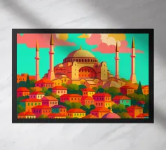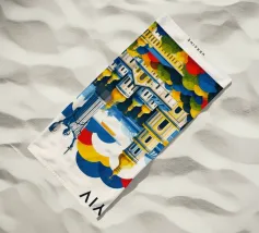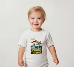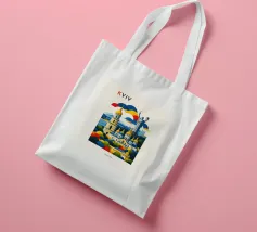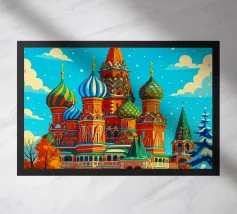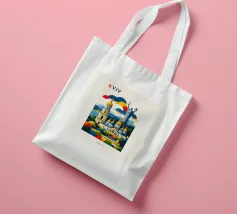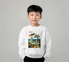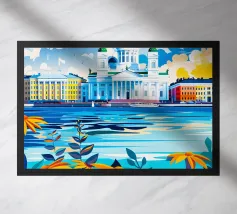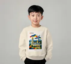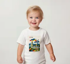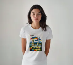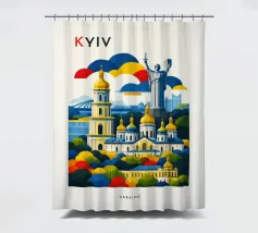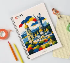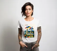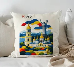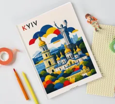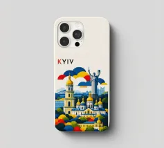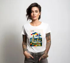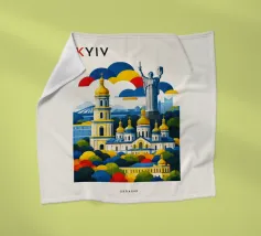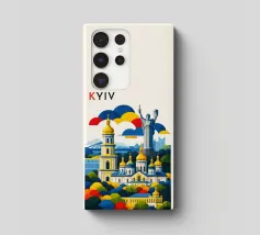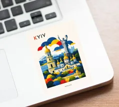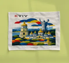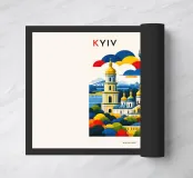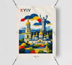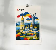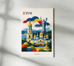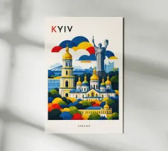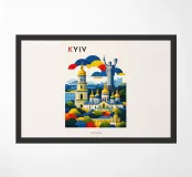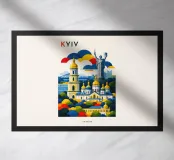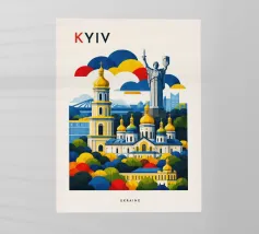 A bold, graphic celebration of Kyiv, rendered through clean geometry and confident colour blocking. Iconic landmarks rise in layered harmony, combining historic architecture and national symbolism into a balanced, uplifting composition. The structured forms and vibrant contrasts convey strength, heritage, and resilience without relying on fine detail.