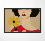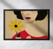Elegante ritratto stilizzato di una donna con capelli scuri e arricciati e un vistoso rossetto rosso, che tiene in mano un fiore giallo in stile Art DƩco.