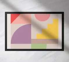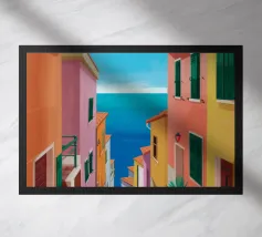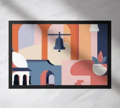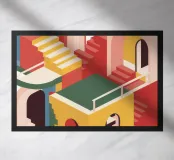 Un complesso e impossibile labirinto architettonico di scale, archi e porte dai colori vivaci.