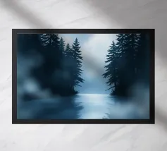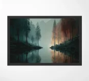 Un paesaggio tranquillo e suggestivo, caratterizzato da una perfetta simmetria e da una quiete ovattata. Uno stretto specchio d'acqua riflette la foresta circostante, creando un riflesso quasi perfetto che sfuma il confine tra terra e cielo. Una fresca nebbiolina ammorbidisce le montagne in lontananza, mentre una luce delicata filtra attraverso gli alberi, introducendo calore e contrasto senza rompere la calma.