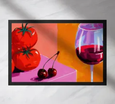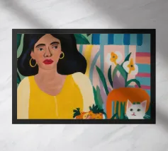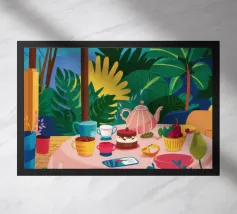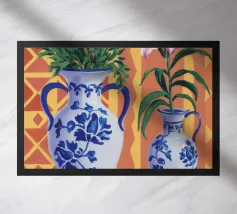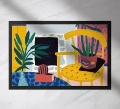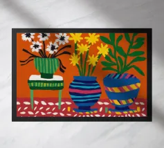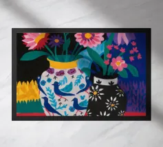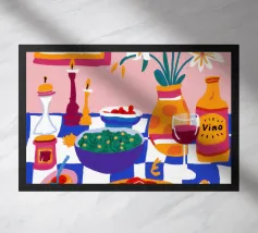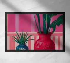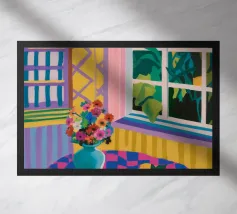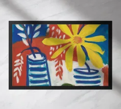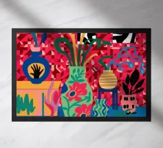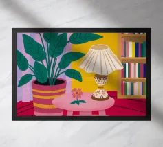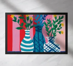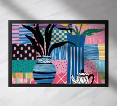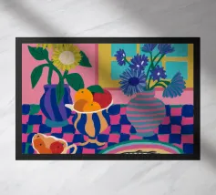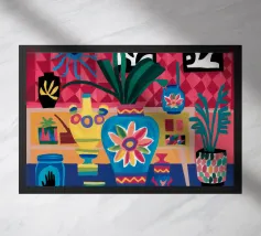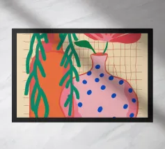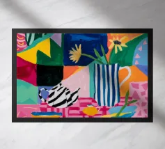 Una natura morta moderna ed eclettica con un paralume a scacchi, un vaso a zig zag e un fiore stilizzato. I motivi e le forme audaci creano una composizione divertente, grafica e di grande stile.