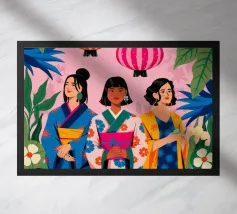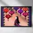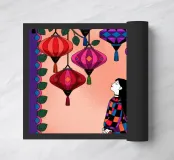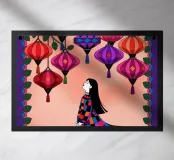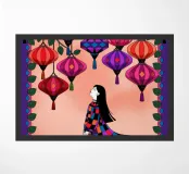 Una donna con un abito colorato si trova sotto un baldacchino di lanterne appese nei toni del rosso e del viola. L'ambiente luminoso proietta una luce sognante e stravagante in tutto il dipinto.