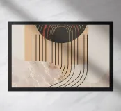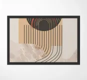 Una composizione geometrica presenta un grande cerchio con archi concentrici, intersecato da linee verticali e ondulate che scorrono su uno sfondo beige e strutturato. L'uso di colori audaci come il nero, il marrone e il rosso crea un contrasto sorprendente. Il disegno ha un'estetica moderna e astratta.