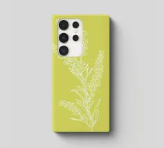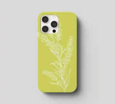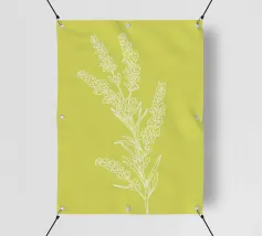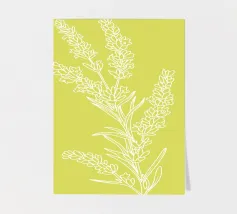 Un dettagliato disegno a linee bianche di un rametto di lavanda risalta con steli allungati e fiori delicati. La semplicità del disegno evidenzia l'eleganza della forma botanica.