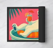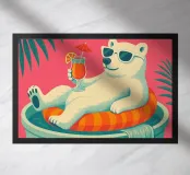 Un'illustrazione stravagante e vivace di un orso polare che vive la sua vita migliore: occhiali da sole, cocktail nella zampa e galleggiante in una piscina per bambini con una mini cascata. Su uno sfondo tropicale rosa caldo, quest'opera d'arte dona un tocco di umorismo e vibrazioni rilassanti a qualsiasi spazio. Perfetto per gli amanti dell'arte eccentrica, dell'estetica retrò e dell'atteggiamento rilassato. Che sia per il salotto, l'ufficio o la casa estiva, questo pezzo garantisce sorrisi.