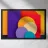 Vibranti forme geometriche in viola, rosso, giallo e blu si sovrappongono su un audace sfondo giallo e scuro, mostrando un'arte astratta dal tocco moderno.
