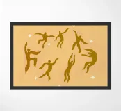 Le figure sono ritratte a metà della danza e sembrano fluttuare su un morbido sfondo color pesca. Ogni figura emana movimento ed energia, creando una composizione armoniosa e ritmica.
