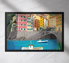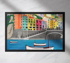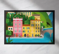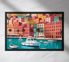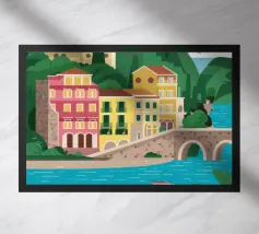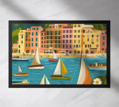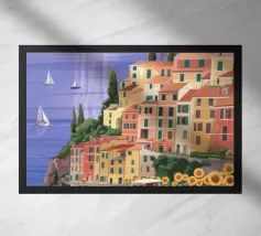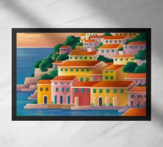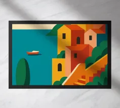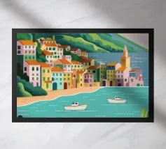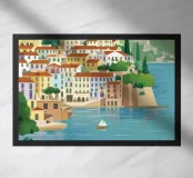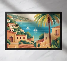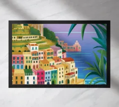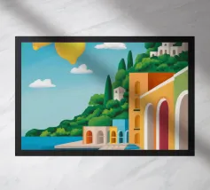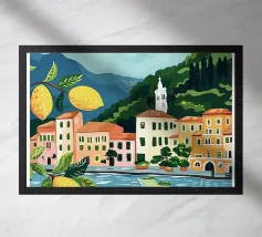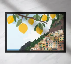 Illustrazione panoramica di una classica città costiera italiana adagiata in una baia, con alberi di limone in primo piano, case bianche sulle scogliere e barche a vela sull'acqua.