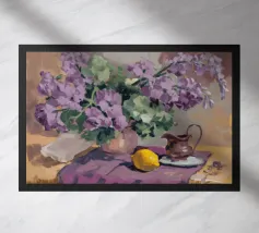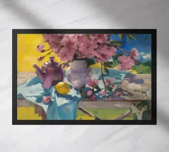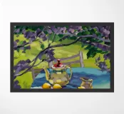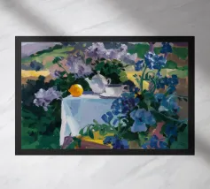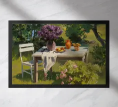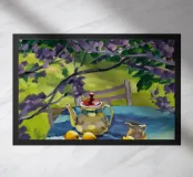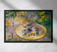 Una natura morta all'aperto raffigura un tavolo con una ciotola di limoni giallo brillante e una bevanda, all'ombra di un albero con fiori o fogliame viola, che suggerisce un momento sereno in un ambiente mediterraneo.