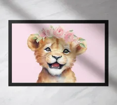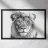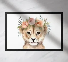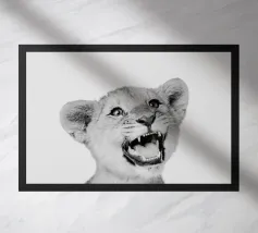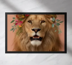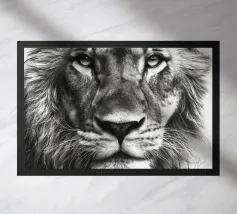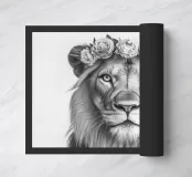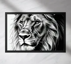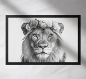 Il ritratto di un leone mostra grandi occhi espressivi e una corona floreale in bianco e nero. La morbida pelliccia è perfettamente enfatizzata in un'illustrazione fotografica minimalista e cattura lo straordinario fascino della natura. Ideale per gli amanti degli animali.